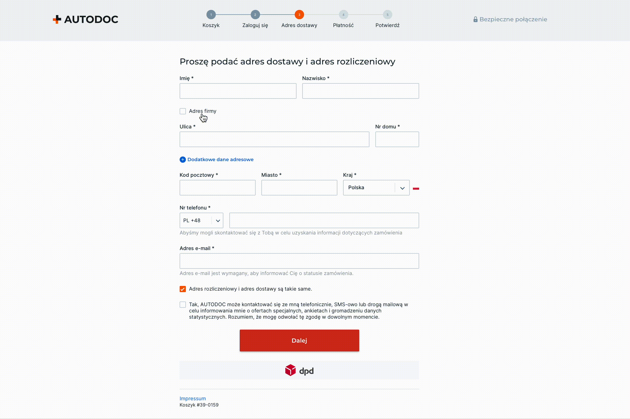 Przed dokonaniem zakupu zawsze dokładnie sprawdź adres. Adres dostawy można zmienić na drugim etapie procesu zamawiania. Pozostałe adresy, w tym adres rozliczeniowy i adres wysyłki, możesz sprawdzić w zakładce Moja książka adresowa na swoim koncie.